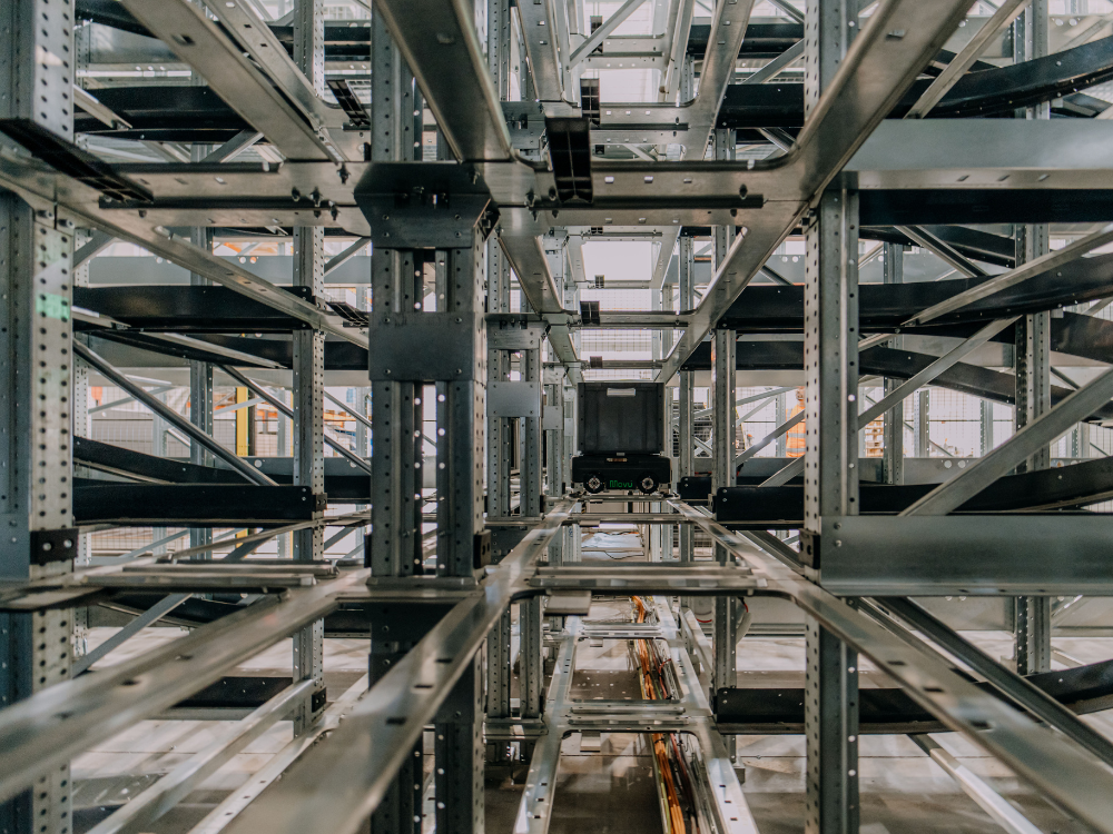 Poput automobila na parkiralištu, robotske platforme transportiraju spremnike između različitih razina u sustavu regala, koristeći rampe.