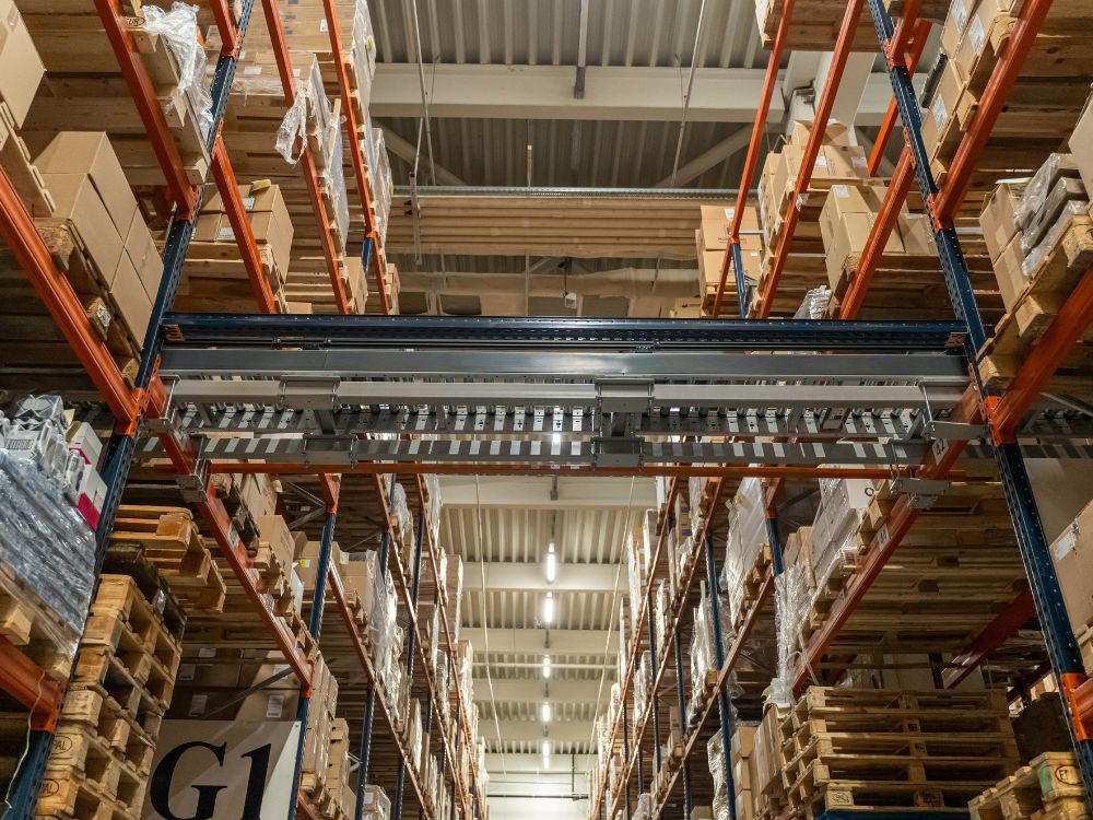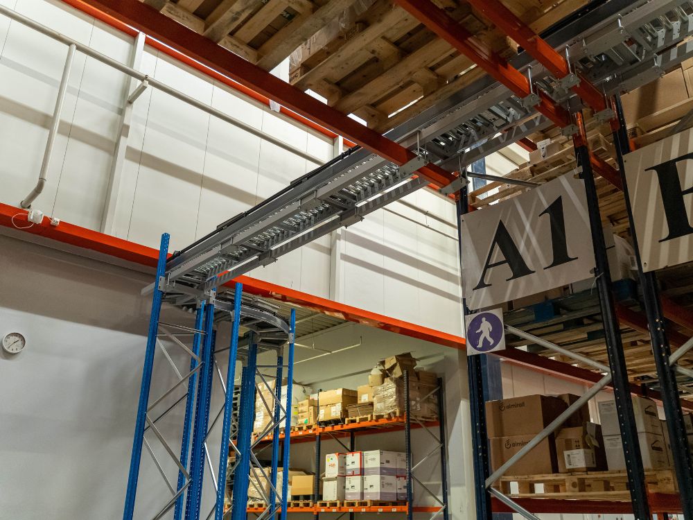 The new Conveyor had to pass through an entire System of Pallet Racking, at a height of up to 4.5 m, without interrupting ground-level operations. This required: